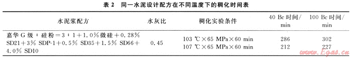 2) 過高估計循環(huán)溫度會致使尾管懸掛器喇叭口水泥石長期無強(qiáng)度。深井Ø177.8mm尾管固井封固段長度可能超過2000m,水泥石上下溫差達(dá)到50℃左右,這些都與循環(huán)溫度密切相關(guān)。
