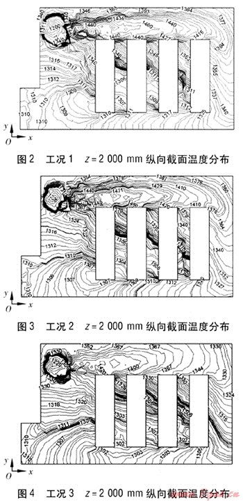 根據(jù)上述模型和運行參數(shù),燃氣和空氣通過后墻上的燃燒器噴入。3種工況在均熱爐中的燃燒模擬結(jié)果圖2~4,它們是通過z=2000mm縱向(爐長方向)上的截面。