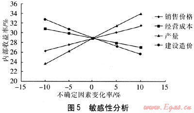 敏感性分析就是預(yù)測(cè)和分析對(duì)項(xiàng)目經(jīng)濟(jì)評(píng)價(jià)起作用的各個(gè)變量因素發(fā)生變化時(shí),對(duì)項(xiàng)目經(jīng)濟(jì)效果的影響程度。圖5分析了二氧化碳在CDM中的銷售價(jià)格、經(jīng)營(yíng)成本、產(chǎn)量和建設(shè)造價(jià)在-10%~10%范圍內(nèi)變化時(shí)內(nèi)部收益率的變化。從圖5可知,當(dāng)產(chǎn)量變化從0變化至10%時(shí),內(nèi)部收益率從28.37%變化至33.31%,變化幅度最大,其次是建設(shè)造價(jià)。產(chǎn)量(即礦井通風(fēng)氣的抽采量)對(duì)項(xiàng)目的經(jīng)濟(jì)效果影響最明顯,其次是項(xiàng)目的建設(shè)造價(jià)。