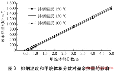 圖3給出了排煙溫度和甲烷體積分?jǐn)?shù)對(duì)盈余熱量的影響。從圖3可以看出,在相同甲烷體積分?jǐn)?shù)下排煙溫度越低,盈余熱量越多,主要是因?yàn)樵诩淄轶w積分?jǐn)?shù)一定時(shí),排煙溫度越低,煙氣中有更多的熱量被回收利用。在排煙溫度一定時(shí),甲烷體積分?jǐn)?shù)和盈余熱量呈線性關(guān)系。