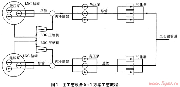 ② 先將BOG壓縮冷卻液化,送入LNG液體總管,然后與其他LNG混合后一起經(jīng)氣化器氣化后再外輸(見圖1)。