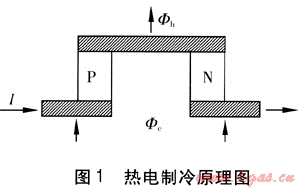 由兩種具有不同熱電效應(yīng)的導(dǎo)體構(gòu)成的回路,通以直流電時(shí)產(chǎn)生吸熱現(xiàn)象,這種現(xiàn)象稱為熱電制冷。半導(dǎo)體材料具有較高的熱電勢,可以成功地用來做成小型熱電制冷器,熱電制冷原理見圖1。N型半導(dǎo)體和P型半導(dǎo)體構(gòu)成的熱電制冷元件,用銅板和銅導(dǎo)線將N型半導(dǎo)體和P型半導(dǎo)體連接成一個回路,銅板和銅導(dǎo)線只起導(dǎo)電的作用。此時(shí),一個接點(diǎn)變熱,一個接點(diǎn)變冷,如果電流方向反向,那么結(jié)點(diǎn)處的冷熱作用互換。