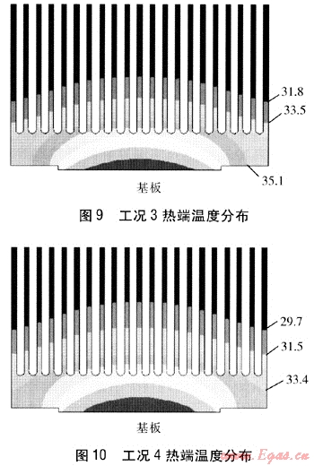 ③ 工況1:輸入電流為4A,保持熱端溫度為40℃,冷熱端溫差為30℃,熱電制冷器的制冷量為25.6W,熱端換熱介質(zhì)溫度為30℃,冷端肋片表面?zhèn)鳠嵯禂?shù)為85W/(m2·K)時(shí),達(dá)到穩(wěn)定時(shí)冷端溫度分布見圖7。圖中數(shù)據(jù)為各等溫層溫度,單位為℃,圖8~10采用同樣方法標(biāo)注。工況2:若熱端換熱介質(zhì)溫度為33℃,要獲得同樣的丁作溫度,則冷端肋片表面?zhèn)鳠嵯禂?shù)為60W/(m2·K),達(dá)到穩(wěn)定時(shí)冷端溫度分布見圖8。