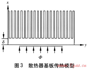 ① 散熱器基板長、寬尺寸遠(yuǎn)大于厚度尺寸,且四周為絕熱,因此基板可視為一維穩(wěn)態(tài)導(dǎo)熱,基板傳熱模型見圖3。