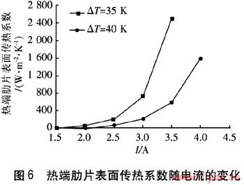 對于散熱面積和傳熱溫差一定的散熱器,提高表面?zhèn)鳠嵯禂?shù)是增加散熱量的有效方法。工作在不同冷熱端溫差下的熱電制冷器,在實(shí)際運(yùn)行中可根據(jù)輸入電流調(diào)整兩端換熱形式。由圖5可知,小制冷量時(shí),冷端可采用空氣自然對流傳熱,隨著制冷量的增加,則需要采用空氣強(qiáng)制對流傳熱或水冷等傳熱方式。由圖6可知,隨著電流的增加,熱端肋片表面?zhèn)鳠嵯禂?shù)急劇增大,風(fēng)冷難以滿足要求。