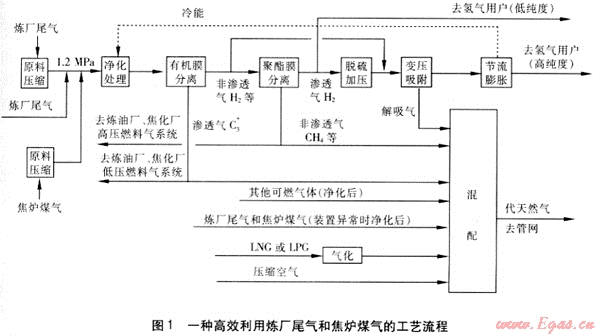 許多城市的煉油廠都與燃氣生產(chǎn)企業(yè)為鄰,甚至雙方已經(jīng)形成了良好的合作關(guān)系,附近有城市燃氣管網(wǎng),鋼鐵生產(chǎn)企業(yè)也可能與此距離不遠。照此看來,如果能將鋼鐵企業(yè)、石化企業(yè)與燃氣企業(yè)聯(lián)合起來,在兼顧各方利益的前提下,采用經(jīng)濟的方式首先提取煉廠尾氣和焦?fàn)t煤氣中的氫氣組分就近利用,之后將其他所有剩余氣體經(jīng)過簡單處理后制成符合要求的代天然氣產(chǎn)品供應(yīng)城市燃氣管網(wǎng),那么,聯(lián)合體各方就會各得其所,實現(xiàn)優(yōu)勢互補,互利互惠。在合作各方獲取效益的基礎(chǔ)上,同時使能源利用價值達到最高化,圓滿解決煉廠尾氣和焦?fàn)t煤氣中各組分物盡其用的問題。
