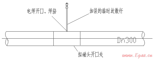 首先仍然是關(guān)閉閥1和閥2,通過放散口1.2將管內(nèi)天燃?xì)夥派?,放散完成后(火炬點(diǎn)不著),在碰頭開口處用電焊焊上一提前預(yù)制好的簡(jiǎn)易放散桿,如圖示: