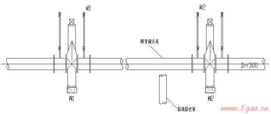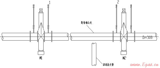 在天然氣中高壓管線上,一般2~3KM(有的甚至長(zhǎng)達(dá)5KM)方有控制閥門,下以長(zhǎng)3KM的DN300鋼管兩閥中間部分需斷管碰頭為例簡(jiǎn)單說明:(如下圖示)
