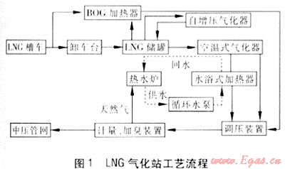 利用卸車增壓氣化器將LNG槽車內的氣相壓力升高,將LNG通過管道卸至站內儲罐。利用儲罐配套的自增壓氣化器來保證儲罐具有一定的壓力,并將LNG送入空溫式氣化器,通過環(huán)境空氣的熱量將LNG氣化為氣態(tài)天然氣。若氣態(tài)天然氣溫度大于5℃,則直接進入調壓、計量、加臭裝置;若氣態(tài)天然氣溫度小于5℃,就需要經過水浴式加熱器將氣態(tài)天然氣加熱到5℃以上,再送入調壓、計量、加臭裝置,最后送入中壓管網。LNG槽車和LNG儲罐產生的BOG排放至BOG加熱器,加熱后送入調壓、計量、加臭裝置,最后送入中壓管網。