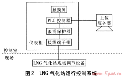 LNG氣化站是由儲罐區(qū)、工藝裝置區(qū)和輔助區(qū)3個區(qū)域組成。對每個區(qū)域都需進行監(jiān)測或控制,關鍵地方還必須采用聯動的方式來保證控制的及時性。要達到以上目的,必須要建設一套LNG氣化站的運行控制系統(tǒng)(見圖2)。運行控制系統(tǒng)分為PLC控制系統(tǒng)和現場調節(jié)設備的自動連鎖控制2部分。