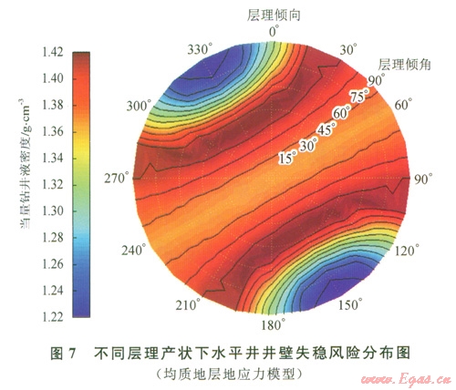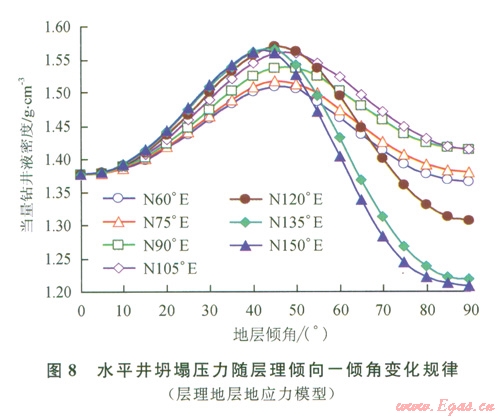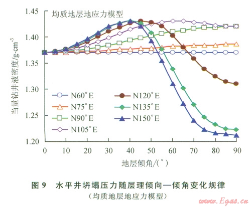 3)在鉆進(jìn)地層傾角為30°~60°之間的頁巖氣藏水平井時(shí),應(yīng)注意具有較高的坍塌壓力。近水平和近垂直的地層中坍塌壓力有所降低,降低幅度與地層傾向有關(guān),越接近最小地應(yīng)力方向下降幅度越大。