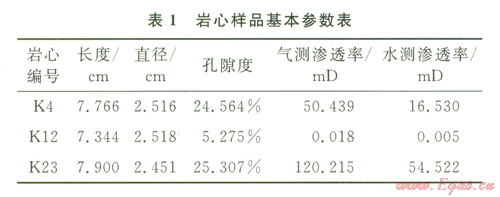 實驗樣品選取某水驅(qū)砂巖氣藏型儲氣庫儲層巖心,代表地下儲氣庫高、中、低各類滲透率級別的儲層,樣品基礎(chǔ)參數(shù)見表l。