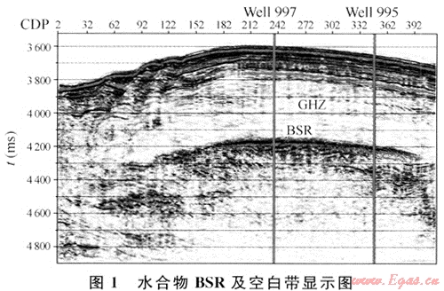 空白反射帶在反射地震剖面上通常與BSR伴生,位于BSR之上。在含天然氣水合物地層中,由于地震波速度增大,使得它與下伏地層之間的反射系數(shù)增大,在地震剖面上,天然氣水合物的底邊界出現(xiàn)相應(yīng)的強(qiáng)反射界面,而在含天然氣水合物的層內(nèi),由于沉積物孔隙被水合物充填膠結(jié),使地層變得均勻,減少波阻抗差,地震反射剖面上通常表現(xiàn)為弱振幅或振幅空白帶(圖1)。