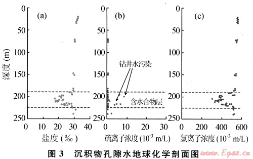 地球化學(xué)識(shí)別主要基于海底淺表層沉積物、沉積物中的自生礦物及底水的綜合分析和研究。淺層沉積物和底層海水的甲烷濃度異常高,通過對(duì)烴類氣體運(yùn)移路徑的追蹤可以間接識(shí)別和評(píng)價(jià)天然氣水合物;淺層沉積物孔隙水含量和異常是識(shí)別水合物層的依據(jù),一般來說,含天然氣水合物的沉積層的孔隙水鹽度和氯度會(huì)降低(圖3)。其次孔隙水中的氧化-還原電位和硫酸鹽含量的降低也可能是天然氣水合物存在的標(biāo)志[8]。