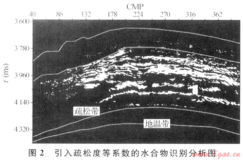 采用疊前AVO反演求得縱橫波速度信息[7]。通常海洋中淺層地層的地震縱波速度為1.6~1.8km/s,在含天然氣水合物層中,地震波速度將提高至1.85~2.5km/s,在速度剖面上,水合物層的層速度變化趨勢(shì)呈典型的三段式,即上下低,中間高。同時(shí)結(jié)合疏松系數(shù)、地?zé)崽荻鹊葏?shù),可以提高水合物識(shí)別的可信度(圖2)。