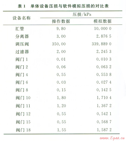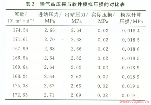 通過輸氣站過程模擬軟件的模擬計算,將計算結(jié)果與各主要生產(chǎn)設(shè)備的實(shí)際壓損數(shù)據(jù)進(jìn)行對比,選擇其中具代表意義的單體設(shè)備分析結(jié)果列于表1。同時,將軟件模擬的全流程參數(shù)計算所得的站內(nèi)壓損與該站實(shí)際生產(chǎn)中的壓損數(shù)據(jù)進(jìn)行比較列表,結(jié)果如表2所示。