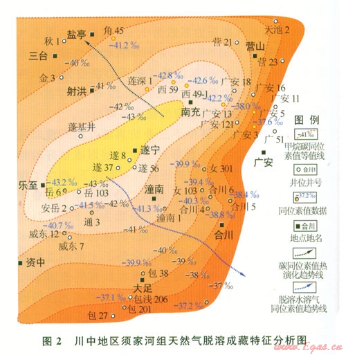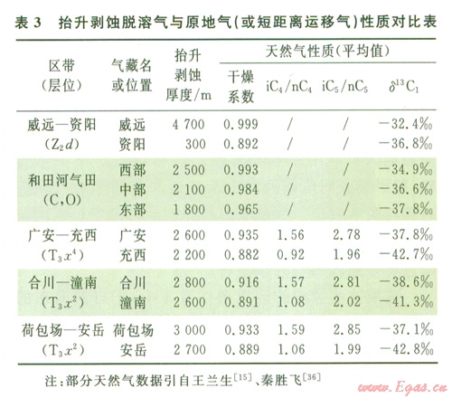 四川盆地中部地區(qū)須家河組地層中水溶氣脫溶聚集與側(cè)向運(yùn)移的現(xiàn)象也很明顯。該區(qū)在廣安、合川、安岳等地探明天然氣地質(zhì)儲(chǔ)量超過(guò)4 000×108 m3。筆者近期對(duì)川中須家河組天然氣的研究結(jié)果也展示出運(yùn)移距離越遠(yuǎn)其甲烷含量越高、甲烷碳同位素值越重、異構(gòu)烷烴增多、丙烷系數(shù)越大等地質(zhì)效應(yīng)。表3還展示該區(qū)須家河組天然氣的組分特征在同一水溶氣的運(yùn)聚路徑上,靠近西部氣源中心的充西須四段氣藏,明顯比遠(yuǎn)離氣源中心的廣安須四段氣藏的氣要濕、iC4nC4iC5nC5值低;在潼南-合川及安岳-荷包場(chǎng)的須二段水溶氣的運(yùn)聚路徑上也存在這樣的地質(zhì)效應(yīng)。更重要的是甲烷碳同位素值變化展現(xiàn)明顯的區(qū)域性變化效應(yīng)。從圖2可知,自安岳-充西以西地區(qū)產(chǎn)生的天然氣地質(zhì)效應(yīng),完全可以應(yīng)用向西埋深加大,須家河組氣源巖熱演化增高生成的天然氣相關(guān)來(lái)解釋。而其東南部地區(qū)只能用水溶氣的側(cè)向運(yùn)移與脫溶聚集來(lái)解釋?zhuān)醇淄樘纪凰刂迪驏|南逐漸加重的水溶氣側(cè)向運(yùn)移與脫溶效應(yīng)。如從安岳與充西地區(qū)的甲烷碳同位素值從-43‰左右,向東南至廣安-合川-丹鳳場(chǎng)-荷包場(chǎng)等地區(qū)的-37‰左右。