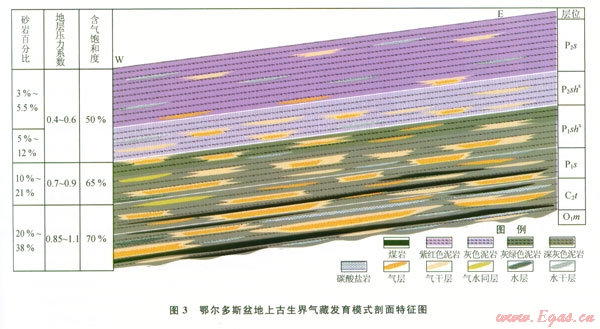 鄂爾多斯盆地蘇里格氣田及其以東地區(qū)的上古生界就具備這樣的地質(zhì)條件(3)。首先其在晚白堊世-新近紀(jì)隆升剝蝕了l 200l 600 m;其次地層存在明顯的低砂巖百分比。如:砂巖百分比由石炭系太原組-下二疊統(tǒng)山西組的20%~38%,向上依次變成下二疊統(tǒng)下石盒子組的l0%~21%、上二疊統(tǒng)上石盒子組的5%~l2%、上二疊統(tǒng)石千峰組的3%~5.5%。正是由于存在產(chǎn)生大面積泥巖吸水效應(yīng)的有利條件,其對(duì)應(yīng)的地層壓力系數(shù)也由太原組-山西組的0.951.1,向上依次變成下石盒子組的0.70.9、上石盒子組-石千峰組的0.40.6。這顯示該區(qū)上古生界地層越向上,其泥巖含量越高,抬升剝蝕后泥巖的吸水率越強(qiáng),壓力系數(shù)也越低;含氣飽和度向上變低,主要是遠(yuǎn)離下部氣源所引起的;雖然上部的含水飽和度增高了,但是主要是束縛水,目前的鉆探還沒(méi)有在石千峰組發(fā)現(xiàn)產(chǎn)水層,只有測(cè)井研究發(fā)現(xiàn)了一些致密的水干層。