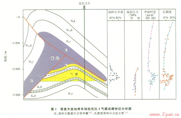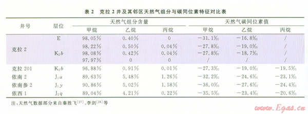 抽吸效應(yīng)的地質(zhì)表現(xiàn)主要包括:氣藏高壓-超高壓(局部氣層壓力與深層相近)、儲(chǔ)層孔隙度增大、天然氣干而丙烷含量稀少、碳同位素值變重、氣藏內(nèi)砂巖儲(chǔ)層高嶺石含量高等特征。如克拉2大氣田的天然氣儲(chǔ)量超過(guò)2 000×108 m3,上述地質(zhì)效應(yīng)都存在。根據(jù)趙文智[13]等人的研究成果,由于構(gòu)造的托舉與抽吸,造成晚期快速與高效成藏,使克拉2井在深達(dá)5 000 m的白堊紀(jì)地層中的砂巖儲(chǔ)層平均孔隙度達(dá)13.7%,最高可達(dá)18%,而上下相鄰層位的砂巖孔隙度多在5%左右(1)。筆者認(rèn)為這種抽吸效應(yīng),還產(chǎn)生了超高壓封存箱現(xiàn)象,克拉2白堊系氣藏地層流體壓力高達(dá)75 MPa左右,其在厚350 m井段測(cè)得的地層壓力基本都是這樣,而其地層壓力系數(shù)上部達(dá)2.22,下部為1.79,展示氣藏內(nèi)部流體系統(tǒng)為壓力基本均一的超高壓封存箱特征。正是這種抽吸效應(yīng),使其儲(chǔ)層中高嶺石的含量激增,在黏土礦物的含量中,高嶺石的百分比含量高(介于40%~80),而該值在上、下鄰層卻極低[26]。也正是這種抽吸效應(yīng),還使得其天然氣組分與碳同位素含量都發(fā)生顯著的變化(2)。如其天然氣組分中甲烷含量高達(dá)98.22%、丙烷含量卻為零或極少,天然氣同位素值偏重,為-27.3‰-27.8‰。而鄰區(qū)依南與依西更靠近侏羅系烴源巖的層位中,甲烷含量?jī)H90%左右,丙烷含量為0.22%~l.58%,其甲烷碳同位素值較輕,為-32‰-36‰。筆者認(rèn)為產(chǎn)生這一天然氣聚集特征主要有兩種成因:①由于抽吸效應(yīng),將深層的高成熟度天然氣快速的抽吸到目前的氣藏中,以致其甲烷含量高、天然氣碳同位素值變重;②水溶氣的脫溶作用也有一定的影響,因?yàn)榈貙铀拿撊軞馓烊粴馓纪凰刂递^重,甲烷含量也較高,天然氣多為干氣。