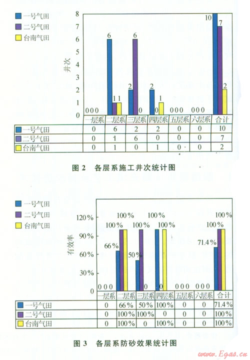 割縫篩管壓裂充填工藝自2000-2011年底,共實施19井次。其中:①一號氣田應用10井次,總體有效率70%,最長有效期4年以上。在二層系應用6井次,有效率67%;在三層系應用2井次,有效率50%;在四層系應用2井次,有效率l00%。②二號氣田應用7井次,總體有效率l00%。在二層系應用l井次,有效率100%;在三層系應用6井次,有效率l00%。③臺南氣田應用2井次,總體有效率l00%。在二層系應用1井次,有效率l00%;在四層系應用l井次,有效率100%(圖2、3)。