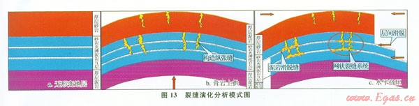 通過裂縫演化分析認(rèn)識到(圖13):受膏鹽巖“上拱”影響,西區(qū)構(gòu)造變形處砂巖常發(fā)育高角度構(gòu)造縱張縫。受龍門山南動向應(yīng)力擠壓,是砂巖間的薄層泥巖發(fā)生層間錯動,從而形成近水平層間滑脫縫。構(gòu)造縫+層間縫=網(wǎng)狀裂縫是儲層重點(diǎn)目標(biāo)。