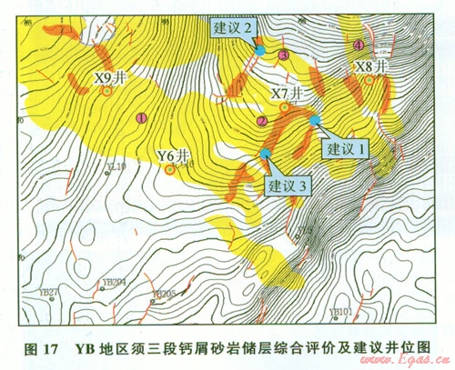 通過鈣屑砂巖沉積特征分析,確定鈣屑砂巖沉積在水退層序頂部的分流河道中,利用沉積相、地震屬性分析,實(shí)現(xiàn)鈣屑砂巖分布預(yù)測;通過區(qū)域應(yīng)力場,局部應(yīng)力、構(gòu)造變形特征分析、裂縫成因演化分析,確定須三段層有利裂縫為網(wǎng)狀裂縫,具有“雜亂反射”特征,利用多種地震屬性實(shí)現(xiàn)裂縫預(yù)測;通過儲層上部地層存在的削截現(xiàn)象,實(shí)現(xiàn)了短期沉積暴露面分布預(yù)測。結(jié)合以上預(yù)測結(jié)果,實(shí)現(xiàn)YB地區(qū)須三段鈣屑砂巖儲層油氣富集區(qū)綜合預(yù)測。預(yù)測結(jié)果顯示油氣富集區(qū)主要集中在鈣屑砂巖發(fā)育帶疊加構(gòu)造裂縫發(fā)育帶,在此基礎(chǔ)上分別在1號、2號、3號砂體提交了3口開發(fā)建議井井位(圖17)。