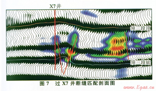 通過合成地震記錄標(biāo)定,確定X7井須三段鈣屑砂巖儲層為強(qiáng)振幅地震反射特征,砂體頂?shù)追謩e對應(yīng)強(qiáng)波峰或者強(qiáng)波谷;地震剖面上測試段砂體表現(xiàn)為“透鏡狀”反射特征,表明砂體為分流主河道砂體;X7井測試段東部