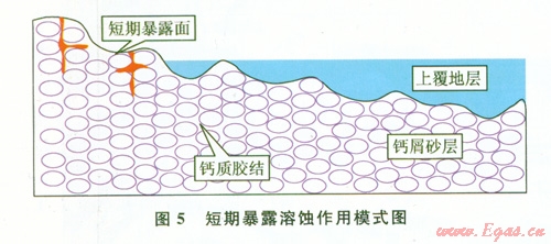 早期短期暴露溶蝕作用是指在砂巖沉積后,由于砂體處于短期的古地理高部位,短期內(nèi)后期沉積物沒有覆蓋到沉積地層,或者沉積后存在小范圍的不整合面,導(dǎo)致大氣淡水以及地表滲流水對易于溶蝕的鈣屑砂巖地層進(jìn)行溶蝕、滲透,在靠近地表地區(qū)形成一定規(guī)模的溶蝕縫洞系統(tǒng)(圖5)[5]。但早成巖階段形成的溶蝕縫洞規(guī)模有限,在中-晚期成巖階段容易被膠結(jié)、壓實(shí)、充填,對儲層孔隙建設(shè)的作用非常有限。