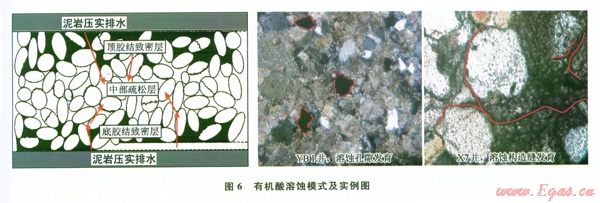 晚期有機(jī)酸溶蝕作用是指在須三段泥巖壓實(shí)過程中排出的有機(jī)酸對鈣屑砂巖中的碳酸鹽鹽巖膠結(jié)物以及碳酸鹽巖碎屑顆粒進(jìn)行溶蝕,形成溶蝕裂縫及溶蝕孔隙(圖6)。