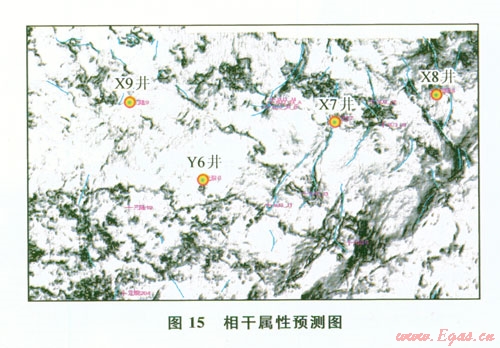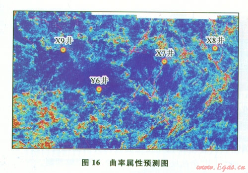由于須三段儲層的重點(diǎn)勘探目標(biāo)“網(wǎng)狀裂縫”通常具有“雜亂反射”地震響應(yīng)特征,因此,可以利用多種反映地震子波橫向不穩(wěn)定性的地震屬性進(jìn)行裂縫預(yù)測(圖15、16)。