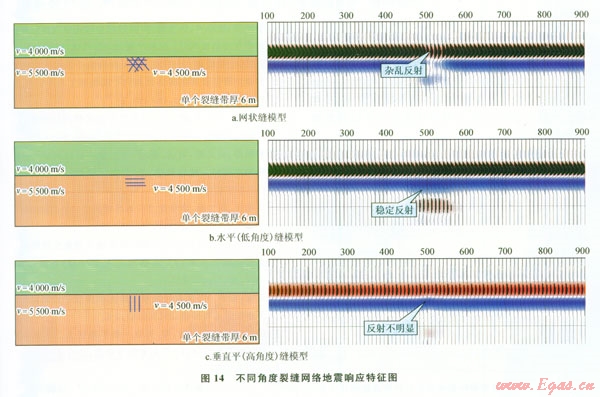 通過不同類型裂縫網(wǎng)絡(luò)模型正演(圖14):網(wǎng)狀裂縫具有典型的雜亂反射特征,而近水平裂縫表現(xiàn)為穩(wěn)定強(qiáng)反射特征,高角度垂直縫沒有明顯地震響應(yīng)。因此,利用“雜亂反射”屬性進(jìn)行須三段裂縫預(yù)測。