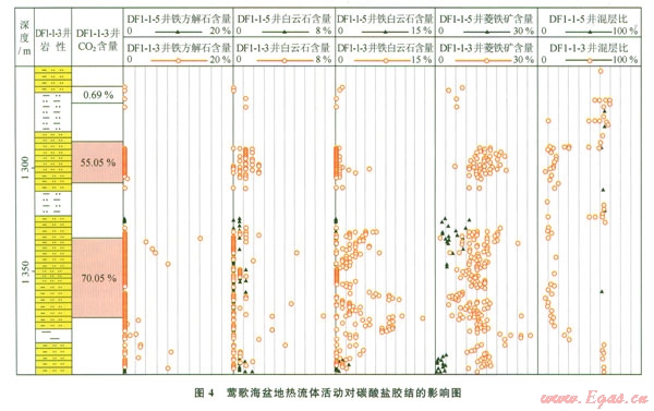鶯歌海盆地淺高溫碳酸鹽膠結(jié)物與熱流體活動有關(guān),東方1-1,樂東15-1淺中層膠結(jié)物示,含鐵白云石和含鐵方解石的形成溫度間,這些高溫礦物可產(chǎn)出在1