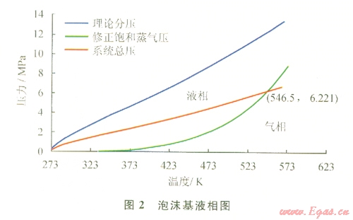 根據(jù)以上的分析可得到泡沫基液相圖(圖2)。從圖2可知,當系統(tǒng)溫度到達546.5 K,壓力達到6.221 MPa時,理論分壓線與修正飽和蒸氣壓線相交,即該交點為此系統(tǒng)發(fā)生相變的分界點,低于該點的系統(tǒng)溫度和壓力,泡沫流體不會發(fā)生相變,高于該點的系統(tǒng)溫度和壓力,泡沫流體發(fā)生相變。