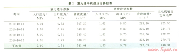 富胺液透平設(shè)計(jì)人口壓力為8.371 MPa,出口壓力為l.110 MPa,壓力差為7.261 MPa,設(shè)計(jì)流量為596 t/h,回收能量1 006 kW,主電機(jī)輸出功率為104kW。受上游原料氣壓力調(diào)低的影響,原料氣壓力由8.39 MPa下調(diào)至8.00 MPa,液力透平相關(guān)參數(shù)相應(yīng)有所下降。2010年10月13-16日,第3聯(lián)合裝置進(jìn)行100%負(fù)荷性能考核,液力透平運(yùn)轉(zhuǎn)平穩(wěn),相關(guān)性能參數(shù)如表2所示。在原料氣100%負(fù)荷運(yùn)行工況下,透平入口壓力平均值為7.99 MPa,出口壓力平均為0.74 MPa,壓力差平均為7.25 MPa,主電動(dòng)機(jī)輸出功率平均值為248.31 kW,單臺(tái)液力透平回收能量為861.69 kW。通過優(yōu)化液力透平控制技術(shù),各系列裝置在正常運(yùn)行期間均采用液力透平驅(qū)動(dòng)模式,且裝置工藝運(yùn)行無波動(dòng),透平外輸功率平穩(wěn)。