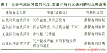 地質(zhì)異常找礦理論和方法是基于對(duì)“致礦地質(zhì)異?!钡纳钊胙芯?,對(duì)包括非傳統(tǒng)礦產(chǎn)資源在內(nèi)的各類礦產(chǎn)資源進(jìn)行預(yù)測(cè)的有效理論和方法[l8],其在非傳統(tǒng)金屬礦床的勘探中已經(jīng)取得了很大成功[19-22]。對(duì)于頁巖氣這種非傳統(tǒng)油氣資源,地質(zhì)異常找礦理論與方法也具有廣闊的應(yīng)用前景。筆者基于頁巖氣地質(zhì)異常理論框架研究成果,根據(jù)頁巖氣的特殊地質(zhì)條件,將頁巖氣藏的地質(zhì)異常序列區(qū)分為區(qū)域背景地質(zhì)異常、富集區(qū)帶地質(zhì)異常、潛在工業(yè)區(qū)段地質(zhì)異常和商業(yè)區(qū)塊地質(zhì)異常4個(gè)層次:①區(qū)域背景地質(zhì)異常主要指標(biāo)包括沉積盆地和頁巖發(fā)育;②頁巖氣富集區(qū)帶地質(zhì)異常主要指標(biāo)包括頁巖厚度和總有機(jī)碳含量(TOC);③頁巖氣潛在工業(yè)區(qū)段地質(zhì)異常的主要指標(biāo)包括氣含量和氣儲(chǔ)量;④頁巖氣商業(yè)區(qū)塊地質(zhì)異常的主要指標(biāo)包括頁巖氣產(chǎn)量、產(chǎn)能、頁巖的裂縫發(fā)育程度和脆性。這4個(gè)層次的異常分別是頁巖氣勘探有利區(qū)域、頁巖氣勘探有利區(qū)帶、頁巖氣勘探有利區(qū)段和頁巖氣有利區(qū)塊等4個(gè)不同有利級(jí)別預(yù)測(cè)區(qū)圈定的依據(jù)。頁巖氣地質(zhì)異常的尺度、變量、有利區(qū)級(jí)別的相互關(guān)系可概括為表l。