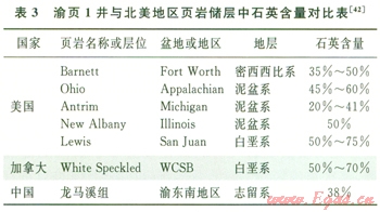 渝東南地區(qū)下志留統(tǒng)龍馬溪組頁巖中的石英含量與美國(guó)已開發(fā)頁巖儲(chǔ)層中的石英含量相當(dāng)(表3),渝東南地區(qū)龍馬溪組頁巖中石英的平均含量為38%,表明該區(qū)頁巖氣儲(chǔ)層多具有良好的可壓裂性。