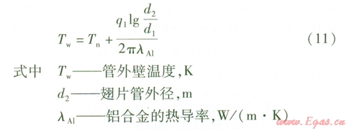 利用通過圓筒壁的導(dǎo)熱公式,計算沒有翅片部分管外壁的溫度Tw,此溫度即為翅片的根部溫度。