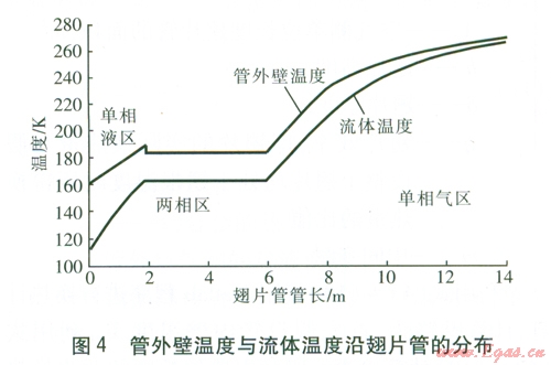 本文對LNG空溫式氣化器單根翅片管的換熱進(jìn)行了模擬計算,計算時沿管長方向?qū)⒊崞芊譃閱蜗嘁?、兩相與單相氣3區(qū),得出了管外壁溫度、LNG(或氣態(tài)天然氣)溫度以及管內(nèi)流體表面?zhèn)鳠嵯禂?shù)沿管長的分布。翅片管的換熱計算是進(jìn)行氣化器設(shè)計的關(guān)鍵,通過進(jìn)行換熱過程的模擬計算,可以確定設(shè)備是否能達(dá)到預(yù)定的氣化能力,并且可以分析LNG的組成變化或環(huán)境條件改變對換熱器氣化效果的影響。本文的計算結(jié)果可以為LNG空溫式氣化器的設(shè)計與優(yōu)化提供依據(jù)。