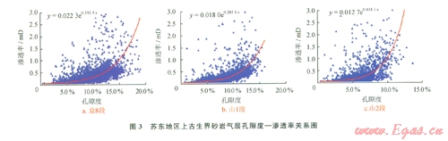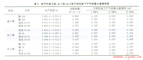 根據(jù)單層試氣井試氣資料,在產(chǎn)能一定的情況下,就可以計算出蘇東地區(qū)主力氣層段產(chǎn)工業(yè)氣的滲透率下限(3)。根據(jù)目前蘇東地區(qū)天然氣儲量規(guī)范,2 0003 000 m井深的天然氣井達到工業(yè)氣流的標(biāo)準(zhǔn)為0.3×104 m3a。當(dāng)采用生產(chǎn)壓差為5 MPa開采時,盒8段產(chǎn)層產(chǎn)氣的滲透率下限為0.120 mD,山l段產(chǎn)層產(chǎn)氣的滲透率下限為0.085 mD,山2段產(chǎn)層產(chǎn)氣的滲透率下限為0.097 mD,這和前述方法得到的結(jié)果基本符合。