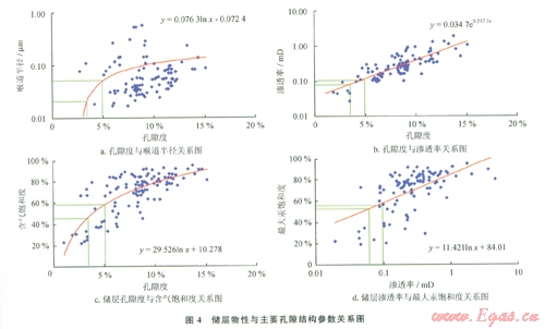 通過蘇東地區(qū)壓汞資料分析認為,壓汞汞驅(qū)替巖樣中潤濕相的過程與地下氣相驅(qū)替地層水的過程是相似的[7]。當(dāng)試驗壓力轉(zhuǎn)化為喉道半徑后,可得到每塊巖樣的含汞()飽和度與喉道半徑之間的相關(guān)關(guān)系(1);再根據(jù)該樣品實測的孔隙度、滲透率值,可得到孔隙度、滲透率、喉道半徑、含汞()飽和度4者的關(guān)系圖(4)