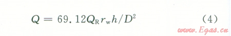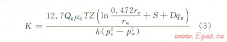 式中Qg為氣井產(chǎn)量,104 m3dpe為地層壓力,MPapw為氣井生產(chǎn)時井底流壓,MPa;T為氣層溫度,Kµg為氣體的地下黏度,mPa·sZ為氣體的偏差系數(shù);h為有效厚度,m;re為泄流半徑,m;rw為井眼半徑,mK為氣層滲透率,mD。這里討論的是氣體流動的最小滲透率值,故可以將井看作為完善井,即設(shè)SDqg等于0。