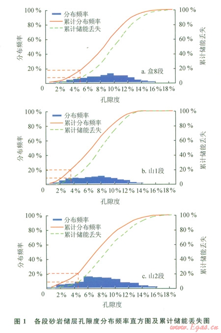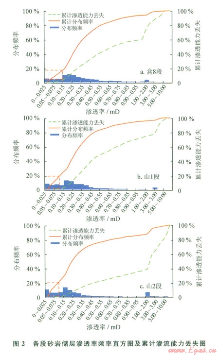 經(jīng)對蘇東地區(qū)盒8段、山1段、山2段的物性特征、巖性特征和孔隙結(jié)構(gòu)特征分析,認為該區(qū)儲層為典型的中低孔-低孔、低滲-特低滲儲層。孔隙度為5%~l5%,滲透率為0.11.0 mD,滲透率能力較差。按照經(jīng)驗統(tǒng)計法(12),考慮到長慶油田低孔、低滲的儲層特點,按照累計頻率丟失不超過總累計的20%,累計儲能、產(chǎn)能丟失不超過總累計的l0%。當(dāng)