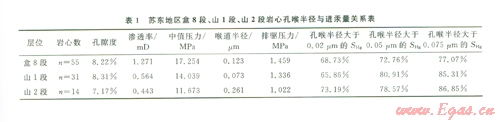根據(jù)蘇東地區(qū)儲層物性,擁有70%以上可供油氣通過的喉道及其所控制的孔隙空間體積為基質(zhì)產(chǎn)氣提供條件,這時所對應(yīng)的孔喉半徑值作為最小流動孔喉半徑[7]。根據(jù)蘇東地區(qū)氣藏樣品壓汞資料分析(1),可得出以下結(jié)論:盒8段、山1段最小流動孔喉半徑定為0.05µm,山2段最小流動孔喉半徑定為002 µm