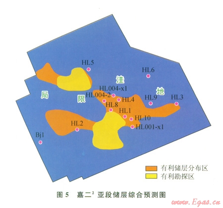 融合多種信息對嘉二2亞段儲層進行綜合預(yù)測(圖5),嘉二2亞段局限臺洼環(huán)境下灘相儲層主要分布在較高部位及其斜坡帶,有利儲層地震反射特征表現(xiàn)為強振幅區(qū)域中相對較弱振幅的暗點反射。儲層平面分布呈現(xiàn)較強的非均質(zhì)特征,HL2井西北及東南斜坡區(qū)、HL8井高部位、南部及東部斜坡、HL5井西部為有利儲層發(fā)育區(qū),其中HL2井東南高部位及其斜坡、HL5井西高點為研究區(qū)下一步最有利勘探區(qū),HL2井西北斜坡、HL5井南斜坡和HL001-Xl井東部地區(qū)為較有利勘探區(qū)。