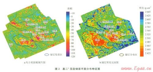 根據(jù)儲層地震、測井響應(yīng)特征,對嘉二段非均質(zhì)儲層采用地震反射特征分析、屬性分析和地震反演,精細(xì)刻畫了嘉二段非均質(zhì)儲層在平面的分布特征[4-8]。