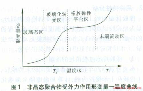 通常所說(shuō)的橡膠是指玻璃化溫度(Tg)低于室溫的非晶態(tài)聚合物。橡膠和塑料就是按照玻璃化溫度是在室溫以上還是在室溫以下進(jìn)行區(qū)分的。玻璃化溫度在室溫以下的聚合物稱為橡膠,玻璃化溫度在室溫以上的聚合物稱為塑料。玻璃化溫度是聚合物的特征溫度之一,非晶態(tài)聚合物在玻璃化溫度附近發(fā)生玻璃態(tài)一橡膠態(tài)轉(zhuǎn)變。圖l為非晶態(tài)聚合物受外力作用產(chǎn)生的形變量一溫度變化曲線。對(duì)于同一種聚合物,當(dāng)其溫度大于Tg時(shí),聚合物處于橡膠態(tài);當(dāng)溫度小于Tg時(shí),聚合物處于玻璃態(tài)。處于橡膠態(tài)的聚合物當(dāng)有外力作用時(shí)發(fā)生大的形變,外力撤去后形變可以恢復(fù),也就是我們通常所說(shuō)的橡膠彈性。在一定溫度范圍內(nèi)(橡膠彈性平臺(tái)區(qū)),當(dāng)溫度降低時(shí),處于橡膠態(tài)的聚合物在外力作用下的形變量隨溫度變化很小。隨著溫度的下降,在玻璃化溫度附近,當(dāng)溫度發(fā)生很小變化時(shí),聚合物受外力產(chǎn)生的形變量隨溫度變化出現(xiàn)明顯變化,表現(xiàn)為隨溫度的降低形變量顯著減小。當(dāng)溫度繼續(xù)降低,聚合物進(jìn)入玻璃態(tài),此時(shí)聚合物已完成了橡膠態(tài)一玻璃態(tài)之間的轉(zhuǎn)變,在外力作用下聚合物的形變量受溫度變化影響很小,形變量也很小。廢舊橡膠低溫粉碎就是通過(guò)冷凍使橡膠溫度降至玻璃化溫度以下,使其進(jìn)入玻璃態(tài),低溫下橡膠分子鏈段不能運(yùn)動(dòng),表現(xiàn)出膪|生,從而易于粉碎。