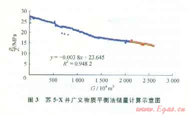 圖3為蘇5-X氣井采用廣義物質(zhì)平衡法儲(chǔ)量計(jì)算示意圖。該井于2007年10月13號(hào)投產(chǎn),截至2010年底累計(jì)采氣量達(dá)到了2574.21×104m3,2009年12月氣體流動(dòng)達(dá)到擬穩(wěn)定狀態(tài),通過(guò)線性直線關(guān)系得到:G=14286.36×104m3。