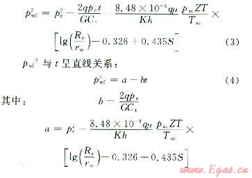 根據(jù)滲流機(jī)理,對(duì)于有界封閉低滲致密砂巖氣藏,氣井開(kāi)井后可分為3個(gè)流動(dòng)階段:①地層線性流階段(無(wú)限導(dǎo)流垂直裂縫,Pwf2-t1/2呈直線關(guān)系)或裂縫地層雙線性流(有限導(dǎo)流垂直裂縫(Pwf2-t1/4呈直線關(guān)系);②平面徑向流動(dòng)階段(Pwf2-lgt呈直線關(guān)系);③穩(wěn)定流動(dòng)或邊界反映階段(Pwf2-t呈直線關(guān)系),該階段又稱為彈性二相段。井底壓力和時(shí)間滿足如下關(guān)系: