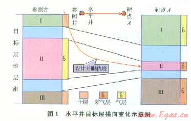 蘇里格氣田儲(chǔ)層非均質(zhì)性強(qiáng),作為水平井目標(biāo)層大多由多套含氣單砂體所組成,它們之間或由泥質(zhì)薄夾層所分隔,或由儲(chǔ)層物性變化所形成的致密夾層所隔離,時(shí)常遇見靶點(diǎn)A處目標(biāo)砂層組與參照井不一樣的特殊情況,即同一單砂體厚度變薄或增厚,含氣性變差或變好,泥質(zhì)夾層變厚或減薄等。而設(shè)計(jì)一般都選擇參照井厚度大、含氣性好的單砂體作為人靶位置。如果遇見入靶點(diǎn)位置目標(biāo)層發(fā)生較大變化,不進(jìn)行調(diào)整仍按原設(shè)計(jì)靶點(diǎn)入靶,則存在原目標(biāo)砂體相變或尖滅風(fēng)險(xiǎn)(圖1),如何保證水平井人靶是優(yōu)化的內(nèi)容之一。