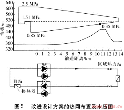 按靜態(tài)水力分析,初步設(shè)計(jì)方案是合理的,最大壓力在首站處(壓力為1.66MPa),外部管網(wǎng)靜態(tài)運(yùn)行壓力小于1.6MPa。動(dòng)態(tài)水力分析顯示,初步設(shè)計(jì)方案的設(shè)計(jì)、運(yùn)行易由于壓力的大幅度波動(dòng)產(chǎn)生超壓或汽化,導(dǎo)致嚴(yán)重的安全問題。為提高輸送干線的安全性,需對(duì)初步設(shè)計(jì)方案進(jìn)行改進(jìn):提高設(shè)計(jì)壓力,取消中繼泵站,系統(tǒng)最大壓力為2.5MPa;在首站處供水溫度提高為135℃,回水溫度不變,供回水溫差加大5℃,流量減小8%;首站循環(huán)泵采用兩級(jí)泵形式,保證控制的穩(wěn)定性。改進(jìn)設(shè)計(jì)方案的熱網(wǎng)布置及水壓圖見圖5。